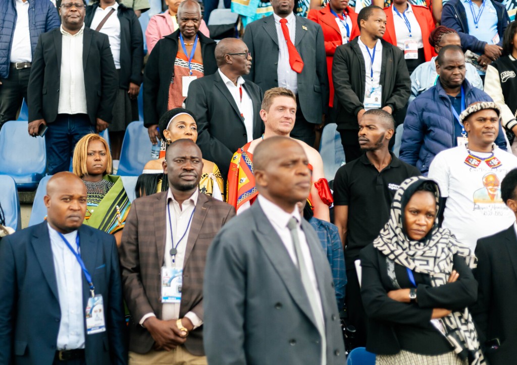 The atmosphere was electric, with a large and enthusiastic crowd filling the stadium grounds. The photos from the event capture a fusion of Eswatini’s rich traditions and modern professional life, as attendees were a mix of people in traditional Swati attire and others in business suits. The day’s program included captivating cultural performances, with groups of people in traditional dress dancing on a grassy field, showcasing a deep respect for national identity.